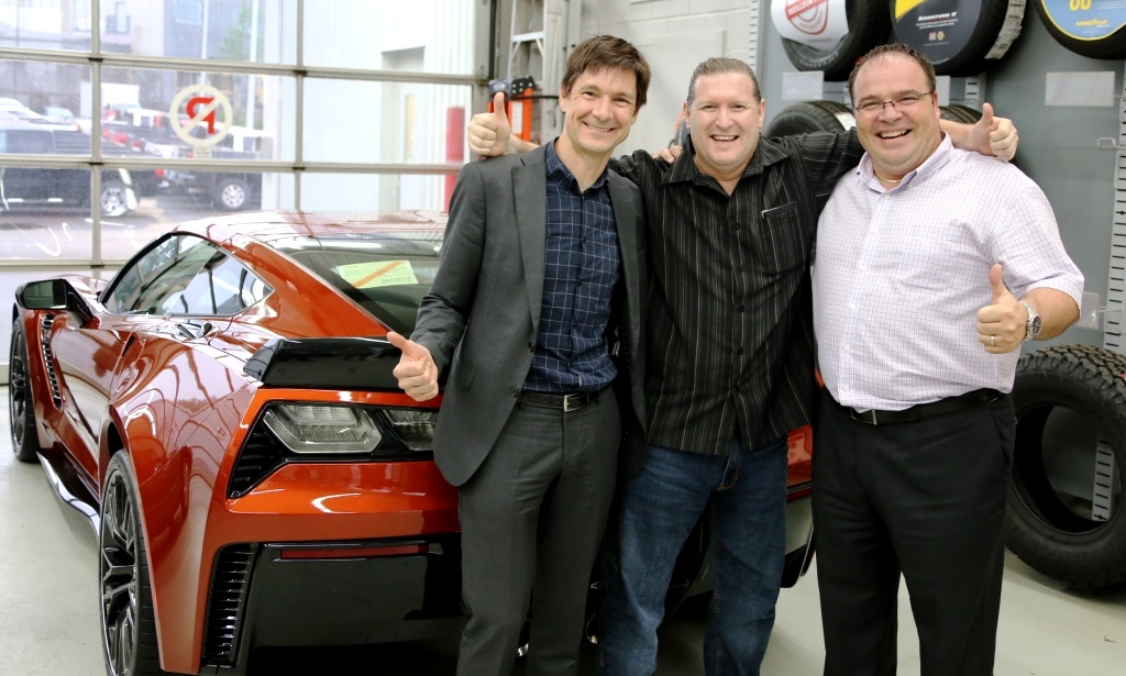 Absolute truth… We started looking in August 2014 for our Z06, only to learn that they were all accounted for. Canada had received allocation prior to the US dealers of a very small number, believed to be 28. We called EVERY Corvette dealer starting from British Columbia and actually added the number up and which dealers had them allocated (as best we could). When we called Cartier Chev Olds in Quebec City, they stated that they had a single allocation which had yet to be taken by any buyer. They related that they were just a bit confused as to why. After they were nice enough to confirm the allocation through the GM District Rep, we gladly placed our downpayment for that Corvette Z06. This is a picture of myself, Guy Lefebvre of GM on the left and Christian Parrot, the VP of Cartier Chev Olds on the right. Do I look happy? Just ask if myself or my wife got tired driving the 9 hour drive back to Niagara!