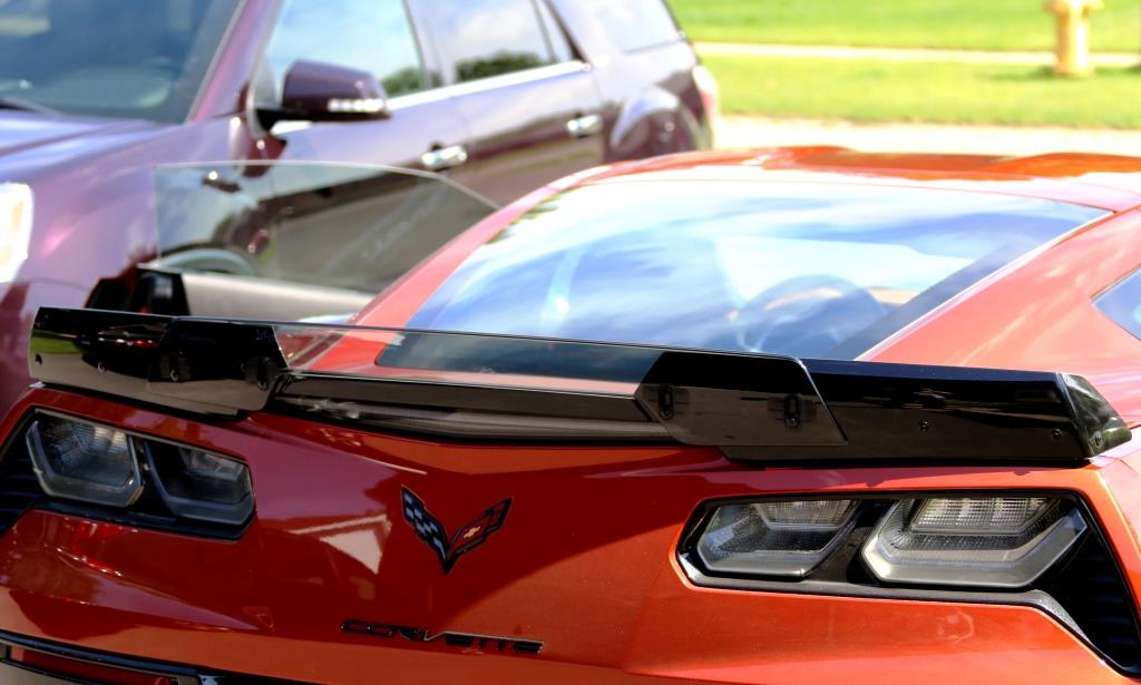 Although a dry sump oil system and titanium intake valves and connecting rods are standard, GM also offers an upgraded Z07 ‘closer to the track’ version that includes Brembo ceramic brakes, upgraded top of the line Michelin Pilot Sport Cup 2 tires and a recalibrated suspension Also, the available Z07 Stage 3 Performance Package can increase the car’s downforce by as much as 500lbs on the track. This photo displays the rear spoiler with center adjustable wickerbill, as one might see in the Z07 package: