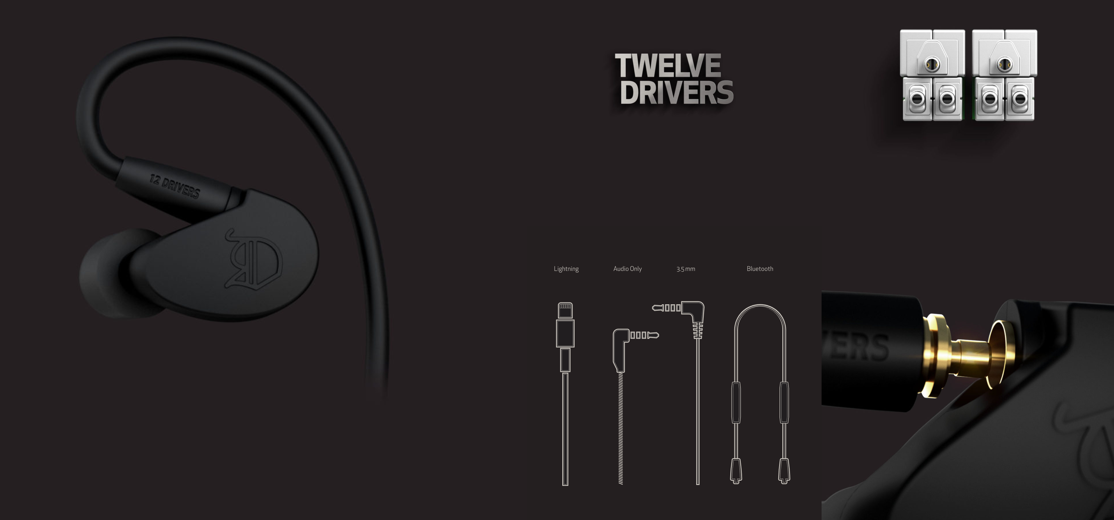 Specs list impedance at 20 ohms, a frequency range of 20Hz to 20,000Hz, sensitivity at 100+/- 3dB@1kHz. The Twelve Drivers are constructed of six balanced armature drivers on each side with 3-way crossovers.