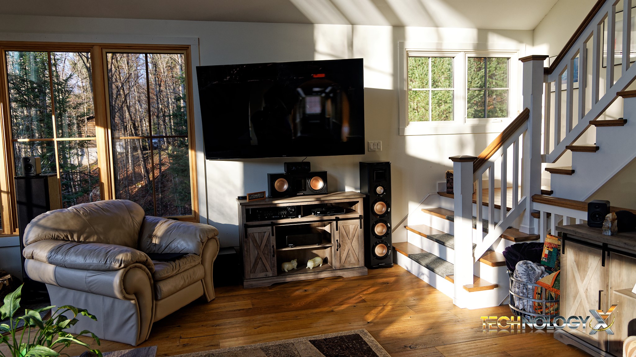 While we are examining this picture though, one might understand where our search for wireless speakers began. We purchased this house new but pre-built and there is simply no way to tap into floors and walls to hide speaker wires (or plugs) without a great deal of damage to the original design. This picture below is a great example of the light entering the room and also shows our former home theatre system.
