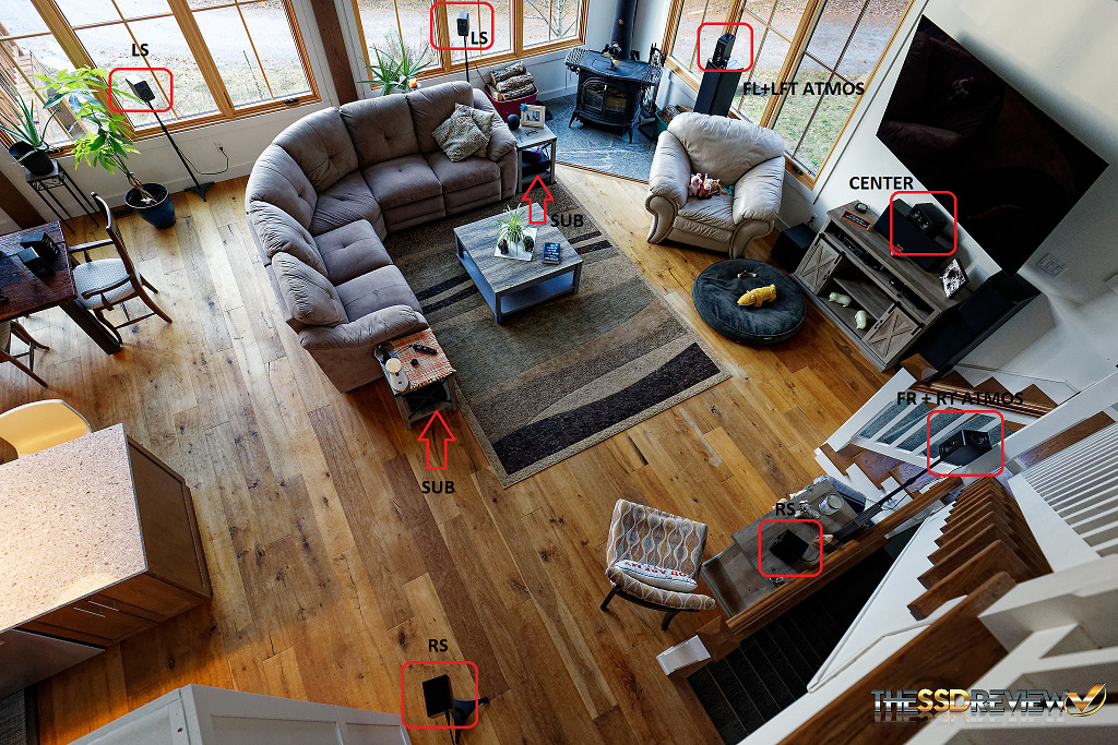 The room is 40′ long by 18′ wide by 25′ high with vaulted ceilings. The front of the house is pretty much completely glass with two levels of 9’x3′ windows which also provides for some very bright days. You might also notice that our specific setup incorporates this 5.1.2 system with the addition of two more rear surrounds and another subwoofer. We had identified long ago that, at least this space required at least two subwoofers. Actually, placement of these subwoofers originally saw the bass reflex ports facing in toward the couch for an amazing real cinematic effect but the controlling member of this team simply didn’t like the bass reverberating in that manner.