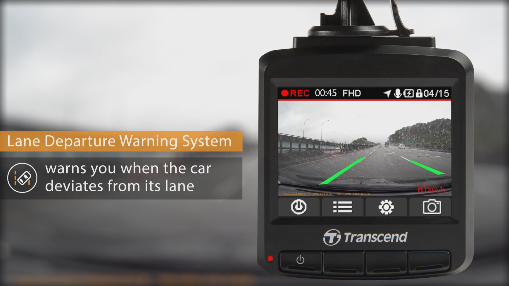 LANE DEPARTURE WARNING SYSTEM (LDWS) – The DrivePro 220 is equipped with driving lane recognition and will recognize the lane edges rather quickly, displaying two green lane marker lines when monitoring.