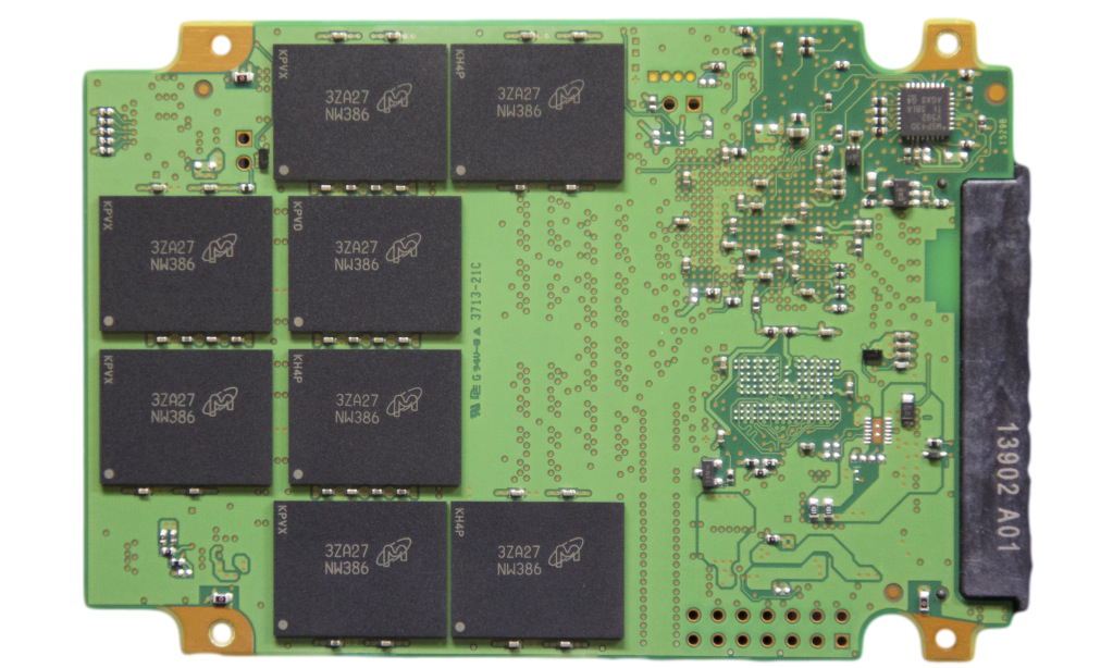 As we open the ADATA SP920 SSD, we can immediately see the drive’s main components on the green printed circuit board (PCB). On this side of the PCB we can see eight (8) synchronous NAND memory modules, made by Micron. Micron also uses shortened model numbers (FBGA) to brand their memory modules. Using their FBGA Decoder, we can enter the FBGA and it will return the full model number, in this case the number is MT29F256G08CECABH6.