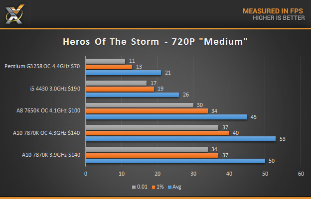 This round of testing at 720P shows much more playable numbers from the 7870K and 7650K, the i5 still trails behind by 100% in average and 1%, and 50% in minimum .01% against the stock clocks and even worse against the overclocked variant.