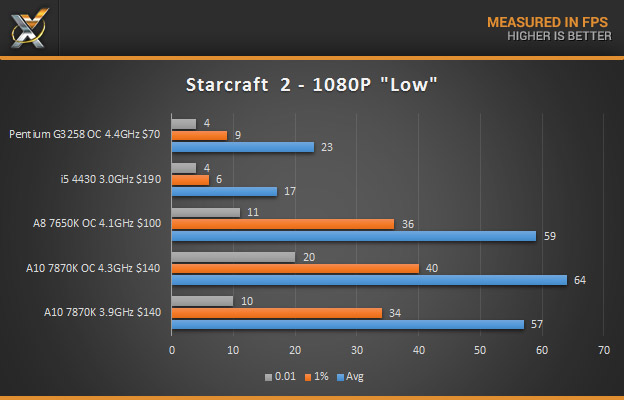 Again, you guessed it the AMD integrated GPUs take the cake again, we do notice our overclock on the A10 7870K seems to make the biggest difference here, almost doubling the minimum frame rate, we would imagine this has to do with a CPU bottleneck during the heaviest part of our benchmark with tons of banlings crashing into a Terran army.