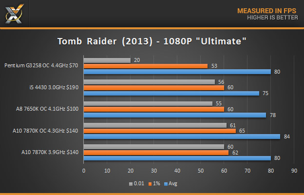Taking a look at these results we see that all of these CPUs can run this game well, with the exception of the Pentium getting some noticeable stutter, although it is rare to get in game and with some lower settings would run very well. Aside from that these results are so close the A10 7870K’s lead is barely noticeable although it never does drop below 60 which is very nice.