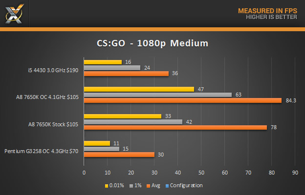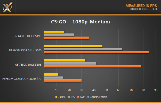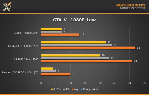 We can see our AMD A8 7650K really pushes the Pentium G3258 and i5 4430 around, with either game being way below playable frame rates, the APU performs 4 times better in minimum frames as well as almost 3 times faster then the i5. If you plan on playing this game without a dedicated card the answer is clear.