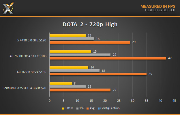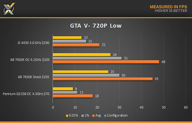 The 720P tests are more of the same, our Pentium falls behind the i5 and suffers from severe stuttering. Our APU is very playable at this setting, while not perfect it is something you can enjoy the game and play through it.