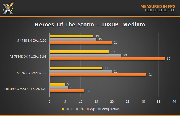 We do see our APU taking a huge lead over the i5 and Pentium in average FPS, but they all seem to hit about the same bottleneck once all of the spells get casted.