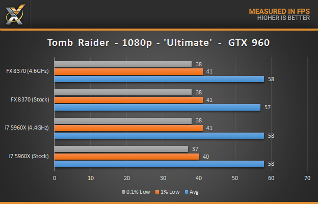 Well I have two FURY’s (around 7% slower than 980ti on latest drivers) on my 8370 (@4.95GHz mind you) and pull 178FPS in Tomb Raider 2013 (ultimate settings), 125 FPS 1440P Ultimate settings and 66 FPS 4k once again at ultimate settings.