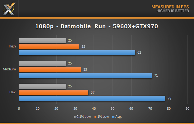 Performance was first tested using the in-game benchmark utility. FPS was recorded using FRAPS, and then analysed using FRAFS. We then used FRAPS to record an in-game, real-world run in the Batmobile in order to quantify the type of performance users can actually expect when playing the game, as we found the in-game benchmark to be an inaccurate representation of the game’s current state.