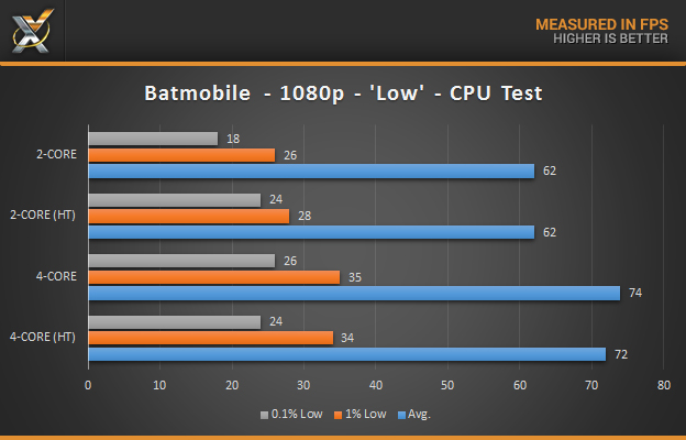 To further test the performance of the game, we decided to re-run our Batmobile test on ‘Low’ settings, and use our Core i7 5960X to simulate other common CPU configurations by disabling cores or hyper-threading to match other SKUs. We left our CPU frequency untouched with our 4.2GHz overclock in order to keep differences to only core count and hyper-threading.