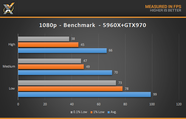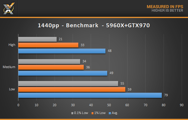 We test the game at several graphical presets which include ‘High’, ‘Medium’ and ‘Low’ and at resolutions of both 1080p, and 1440p. All tests were done at Fullscreen, with Anti-Aliasing (FXAA) enabled, and V-Sync turned off. We also modified the game’s INI files in order to unlock the 30FPS software cap.
