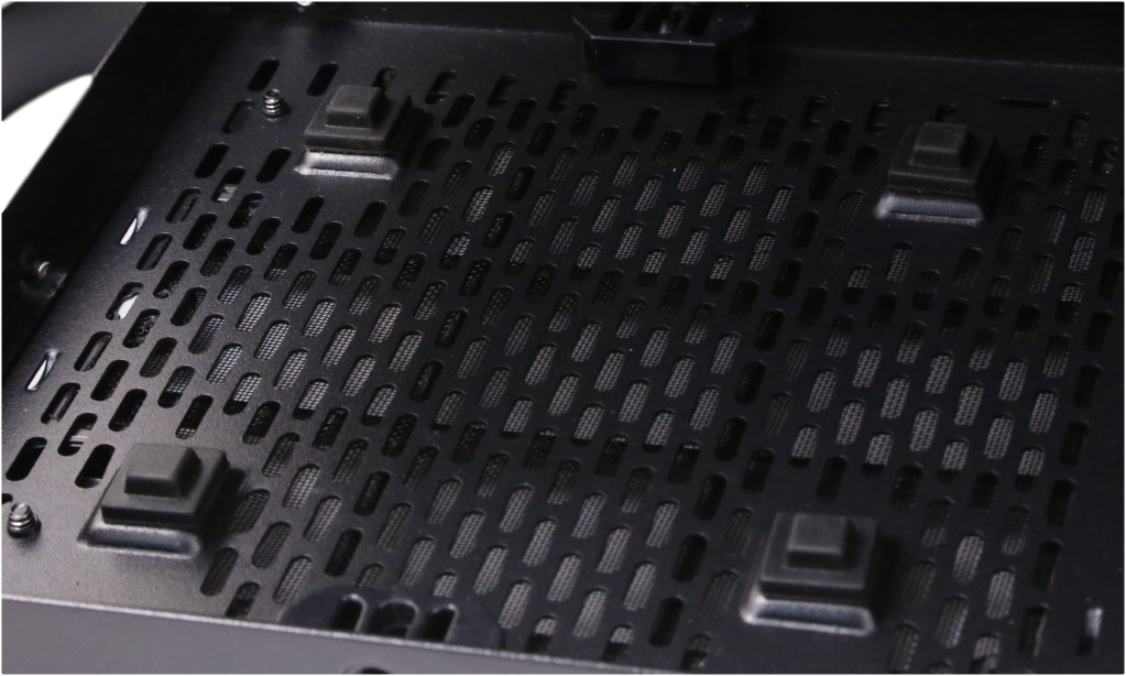 The bottom of the chassis features a magnetic case filter found near the back below the power supply, and four large rubber feet to keep your system securely fastened to the ground.