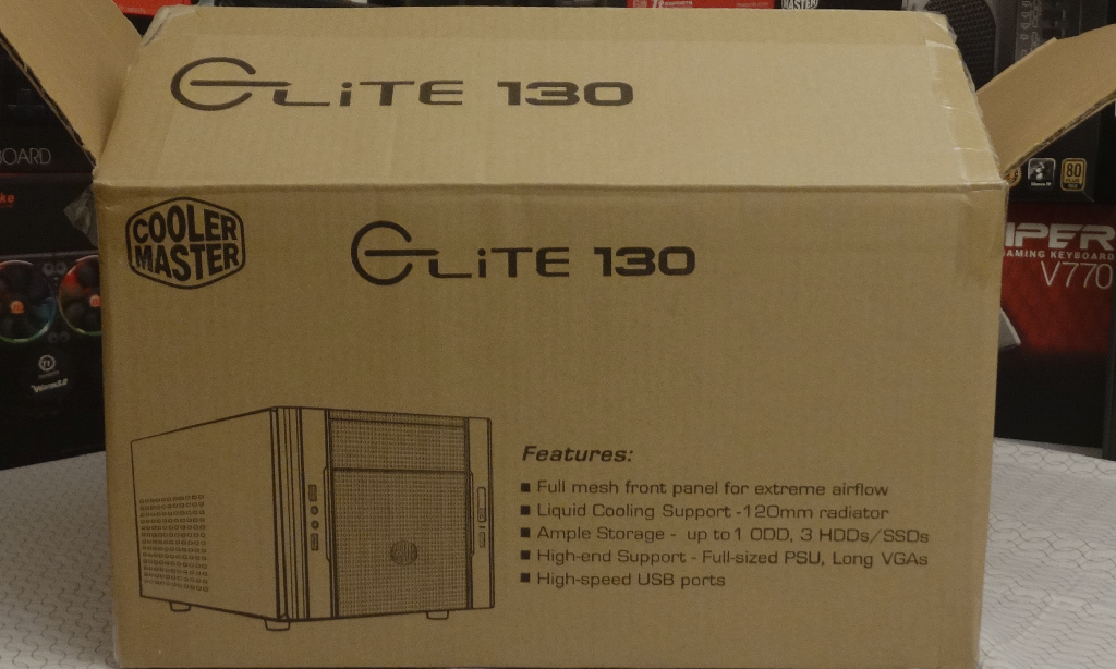 The Elite 130 arrives in a vanilla Cardboard box, which also doubles as a large frame of reference for specifications for the case and a quick image of what the chassis looks like.