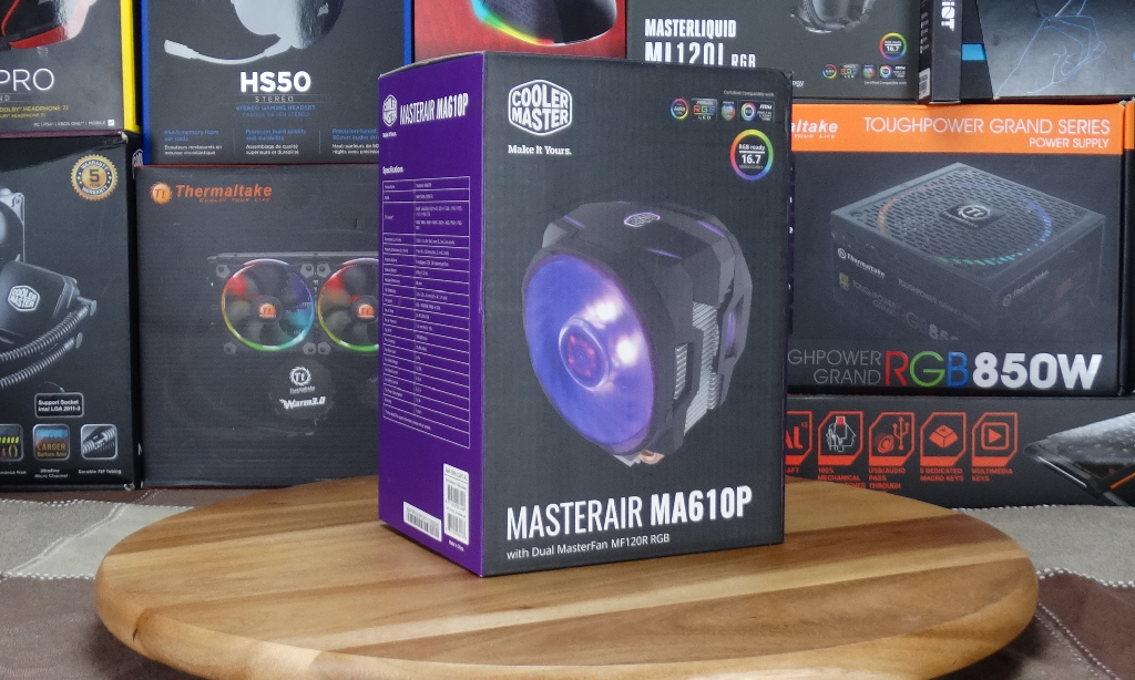Part of the Master Air Series, the MA610P, is a dual 120mm RGB fan design. The design is brilliant and showcased on the front of the retail packaging you can see the cooler while in use.