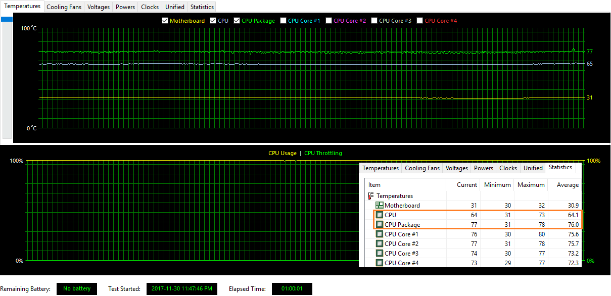 After an hour you can see the CPU sits at a steady 49C and the CPU Package sits around 61.3C. The I7 definitely is running a little warm especially deep into the cores.