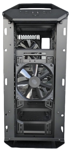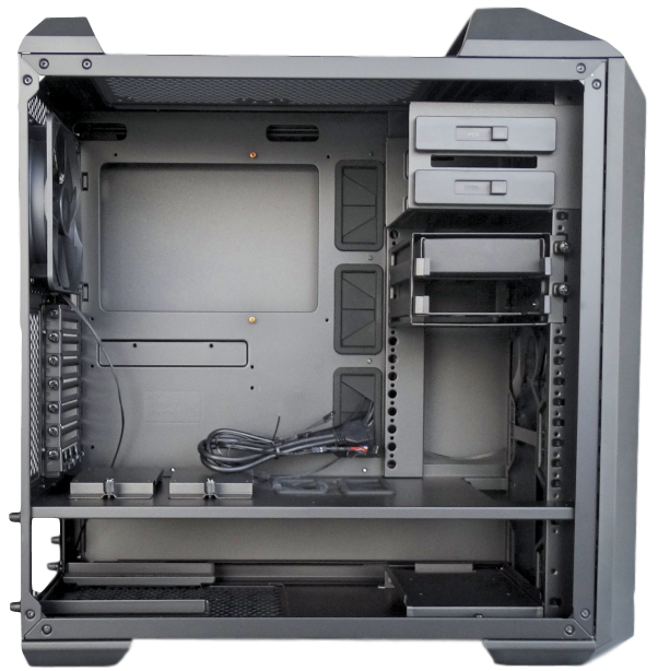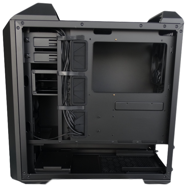 Cable management doesn’t seem to be too difficult as there are three Velcro straps that you can use to assist with that. However there are no tie down points or at least we didn’t locate any. The MasterCase 5 is equipped with three dust-covers as well. One at the top you have to unscrew to clean or remove, one at the bottom that slides out and one at the front panel. The front panel pops off or you can just pop off the dust-cover as well. If you pop the whole panel off you’ll notice one 140mm fan and room for one more.
