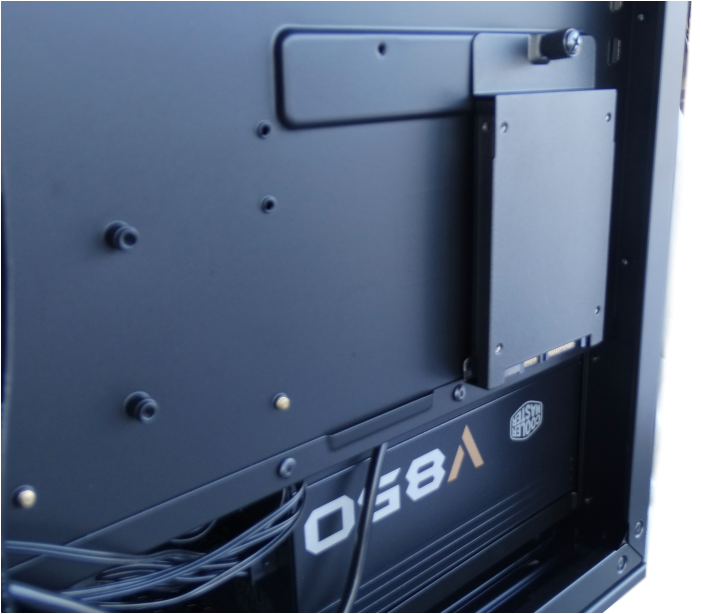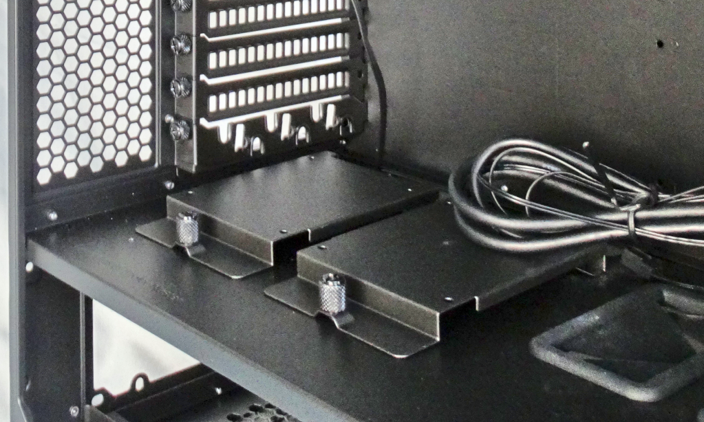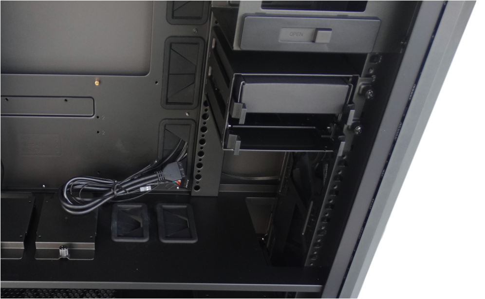 The bottom partition is completely open just as the front to help with cable management. Also you’ll see that the two SSD trays that were sitting on the partition on the front side can also be placed on the backside. If you mount the SSD’s here they must be in the tray or the panel will not close properly.