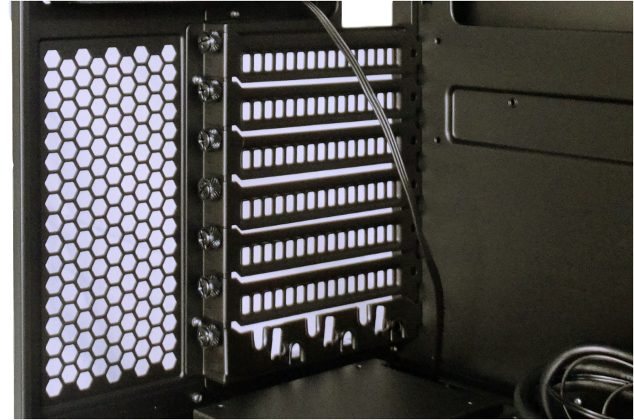 On the topic of the cage you’ll notice it is secured by two thumbscrews on the right side. You’ll also notice that if you take these out you can simply pop out the cage and adjust it up and down from top to bottom of the chassis. If you choose the front radiator and still want the drive bay’s you can even slide them down and place them in the PSU partition area. From the inside you’ll see the MasterCase also comes equipped with two 140mm fans (one front and one rear). Equipped with seven PCI slots, pretty standard except the bottom slot if unused as expansion can be used to pass peripheral cords through and secure them from theft.