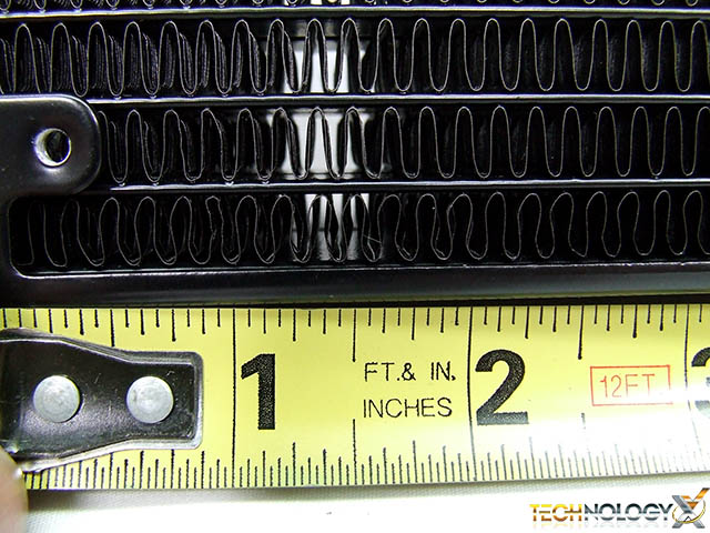 The fin count on the Nepton 140XL measures right about 14FPI which is relatively low and allows the use of lower speed and lower pressure fans for lower noise output.