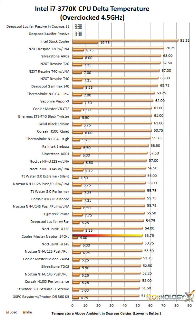 Under stock clocks the Nepton 140XL performed pretty well. Don’t let its position on the chart fool you – it’s only 0.75ºC behind the current leader. Let’s turn up the heat and see how it holds up.