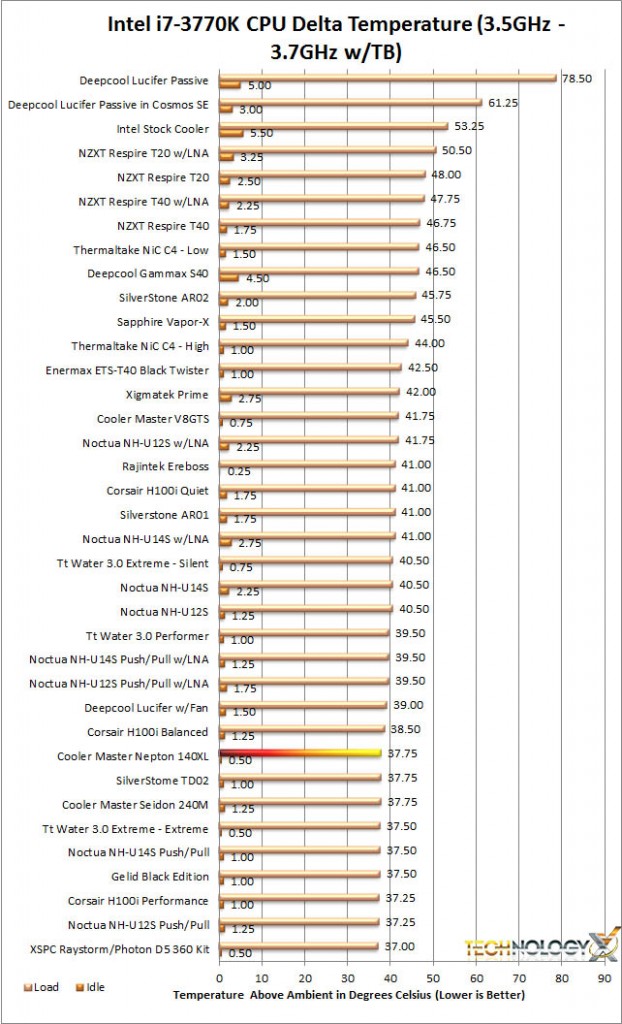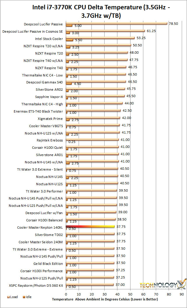 The recorded temperature is the average of the 4 cores. Since ambient temperatures can affect CPU temperature readings ambient temps are recorded during idle and full load testing. The ambient temperature is then subtracted from the recorded CPU temperatures resulting in a Delta T measurement, (or how many degrees above ambient the CPU cooler keeps the CPU). This levels the field for different ambient temperature tests.