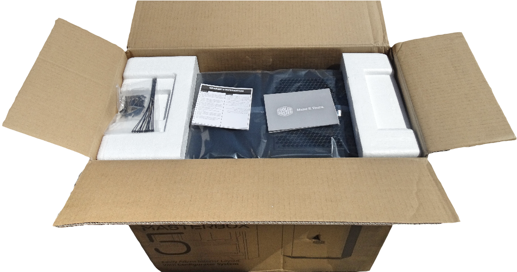 Popping the case out you’ll notice right away it’s lightweight structure. The overall build of the Masterbox 5 is a steel frame and panels with a plastic front panel.