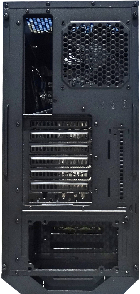 The rear panel is fairly basic showing you motherboard face-plate slot along with seven pci-e slots, the bottom cover is a peripheral, locking plate to help keep your peripherals secure.