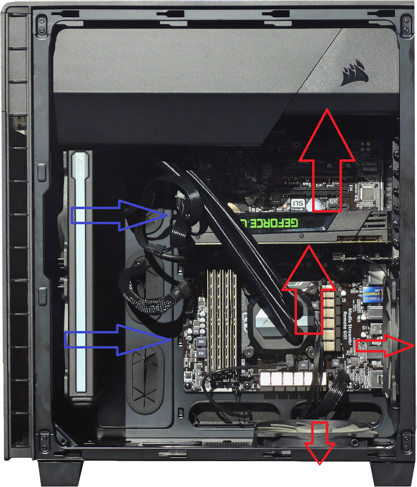 As you can see our chart shows the basic flow of air through our system. For the average gamer or everyday casual user this won’t actually affect you that much. But for those overclocking or pushing your system to it’s limits with much higher end parts the lack of cool air available for your PSU and the fact that the exhaust system is basically moot due to the law of physics saying heat rises, those two exhaust fans aren’t pulling as much warm air out as they usually would if they were at the top of the system.