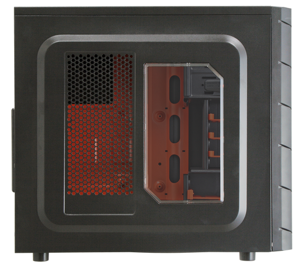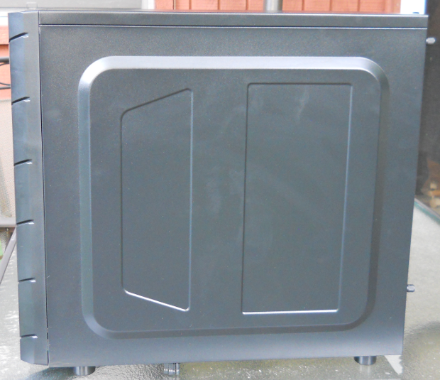 Moving around to the left side panel, we find a vertical mesh opening on the rear half of the panel that supports installation of either one or two 120mm fans. The front half of the side panel contains a clear acrylic window that is offset slightly below the fan mesh opening. The only problem with this setup is that the window lines up mostly over the drive cages, instead of over the motherboard and any add-in PCIe devices. With the purpose of a side window being to show off your build and components, this one rather misses the mark. It would have made more sense to orient the fan mesh opening and the acrylic window horizontally, rather than vertically. The view would be much improved, without compromising the ability to add fans. Also, both side panels lack any sort of “handle” or flange to grip in order to slide the side panel off once the thumbscrews that hold them in place are removed.