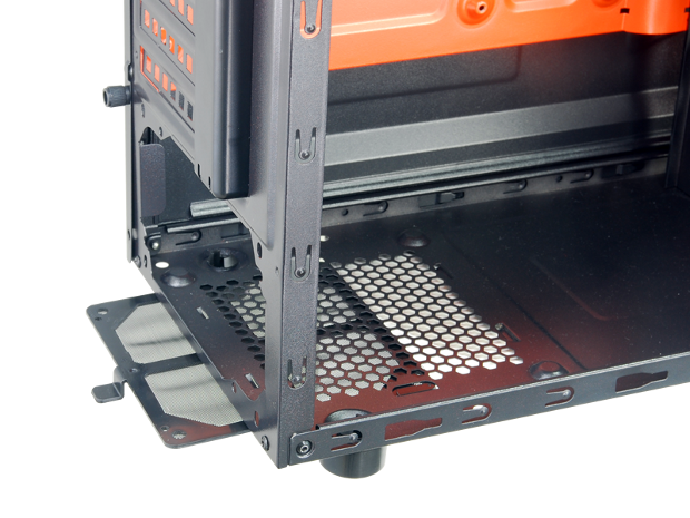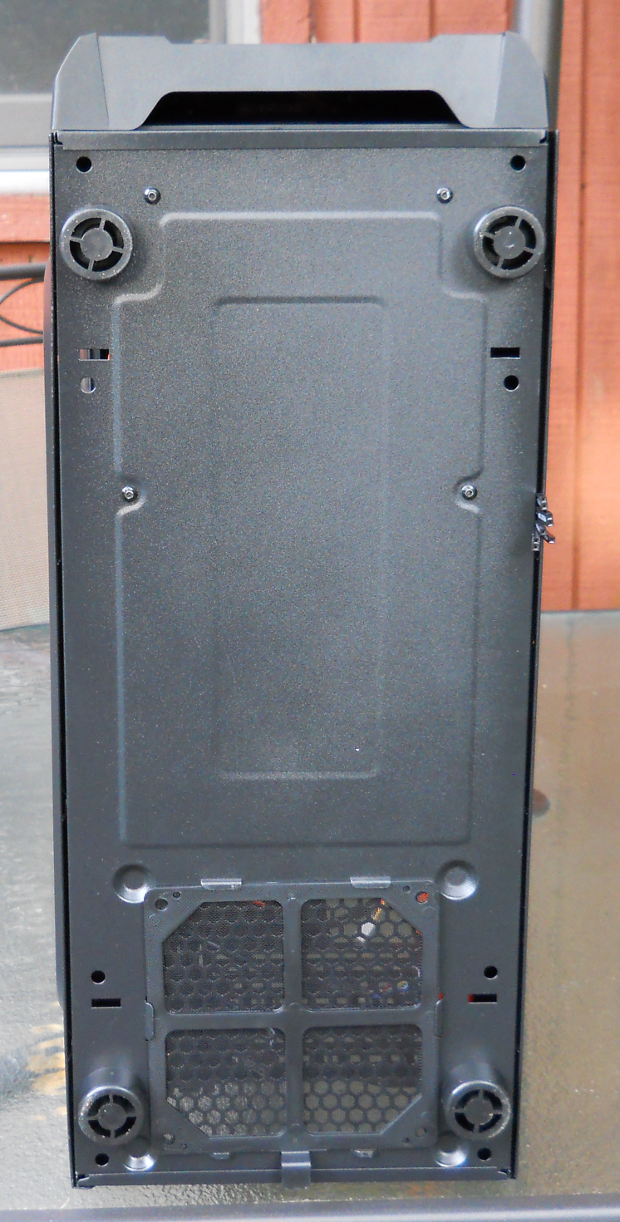 The bottom panel includes four sturdy, rubber-cushioned feet. Also present is an easy-to-remove and easy-to-clean air filter directly below the power supply mounting area. This filter would serve little purpose if one chooses to mount their power supply in a fan-upward orientation.