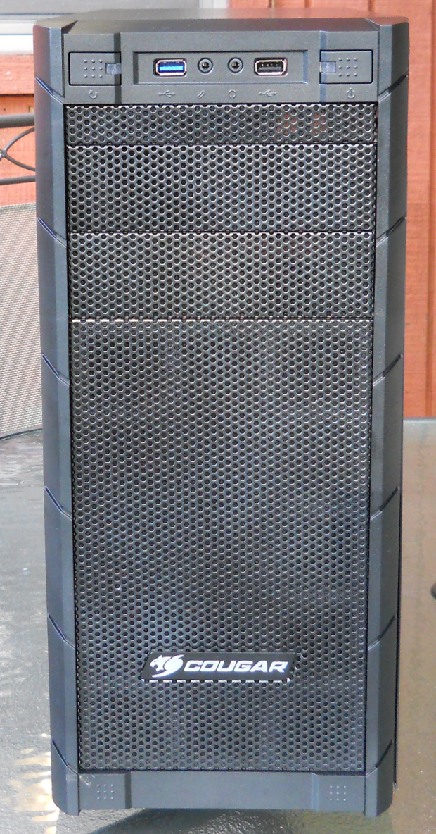 Looking around the exterior of the Cougar Archon, we find an all-mesh front panel, including the removable drive bay covers, which facilitates superior air flow into the case. At the top of the front panel, we find the reset button on the upper left, a USB 3.0 port to its right, headphone and microphone jacks in the center, a USB 2.0 port right of center, and the power switch at the upper right. Both the reset switch and the power switch include bright blue LEDs.