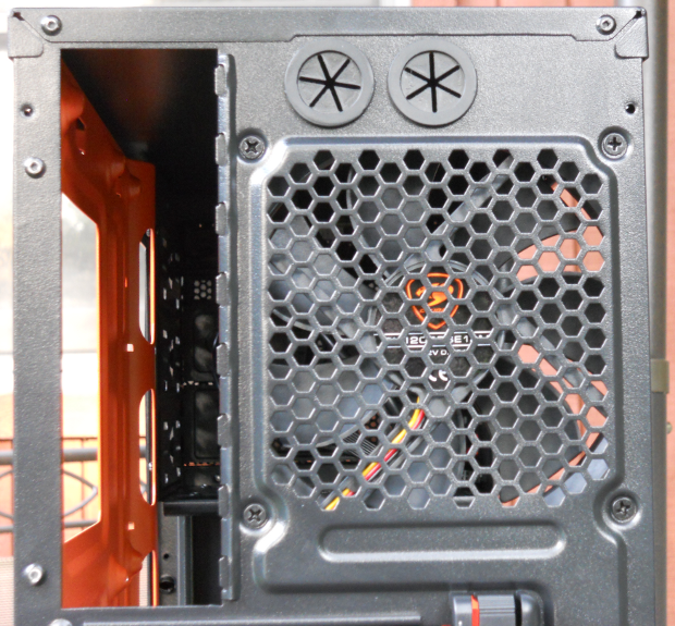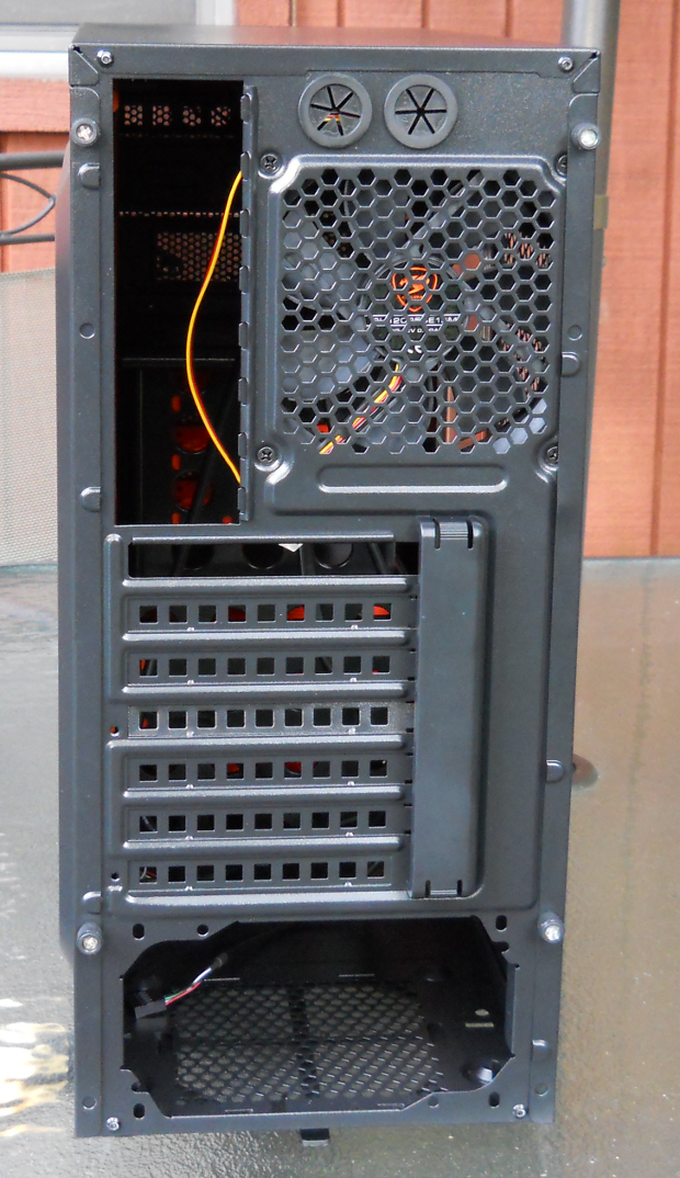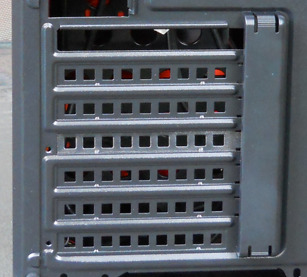 The larger square holes in the expansion bay covers could pose a potential problem with allowing dust and other particulate matter to be drawn into the case from the rear, as the exhaust fan mounted directly above the slots will tend to also draw air from directly below. Most case manufacturers use much narrower slots or a mesh pattern to ventilate these covers, which reduces the opportunity for dust intrusion from the rear of the case.
