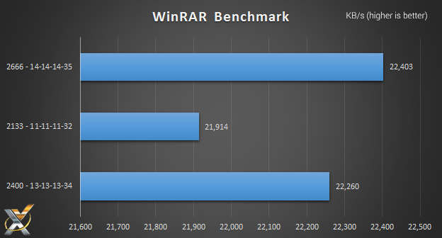 Our WinRAR benchmark displays very much the same as our Cinebench results, while the 2666Mhz configuration does perform faster than the others, it is still a relatively minuscule difference in performance.