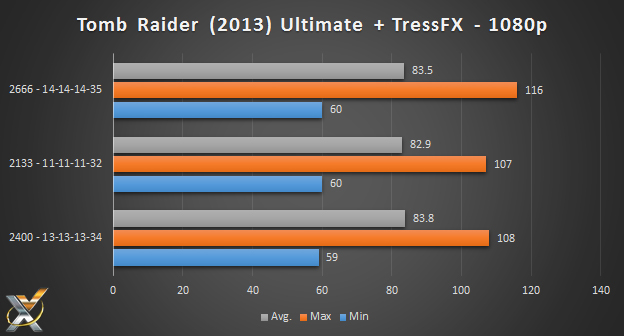 A bench-marking favorite of ours, Tomb Raider always shows consistent performance and this time is no exception. While the max fps is higher on the 2666Mhz configuration, the min and average remain basically the same, meaning you’ll get essentially the exact same gaming experience with all three of these configurations.