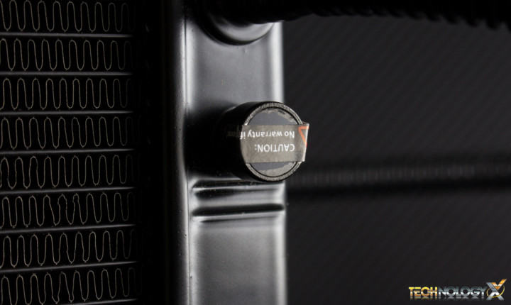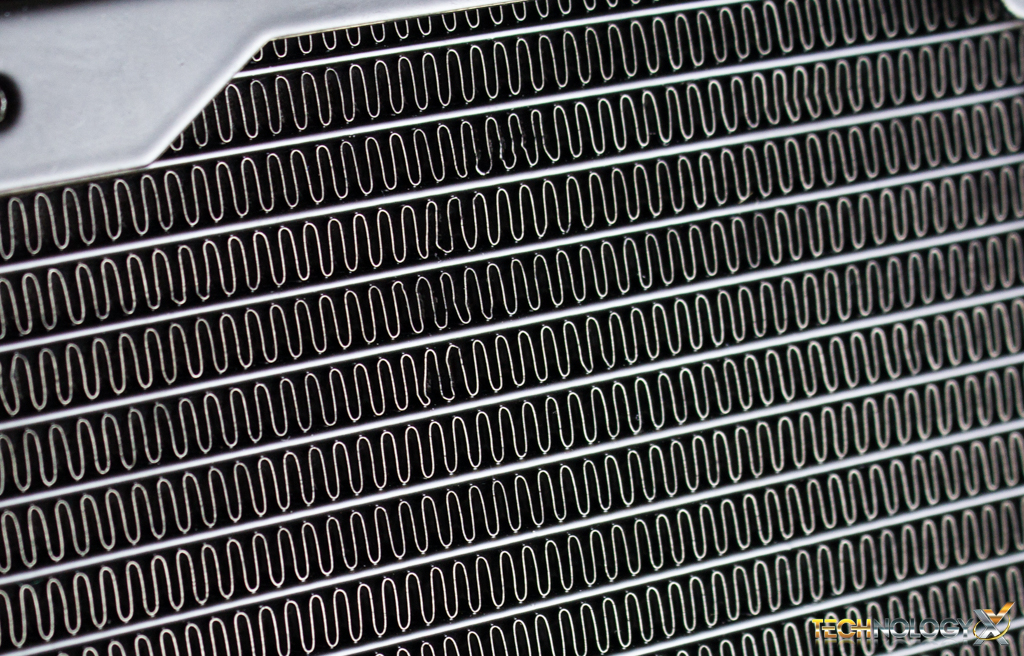 First taking a look at the radiator itself, we’ll see that it is basically your run of the mill radiator, sporting an all black design. It measures 395mm long, or just over 15.5 inches, 120mm wide, and 32mm think. It also has a fin density of 22 fins per inch or 2.54cm, and is surprisingly light due to its aluminum construction.