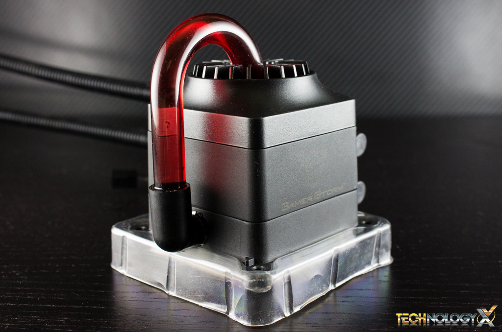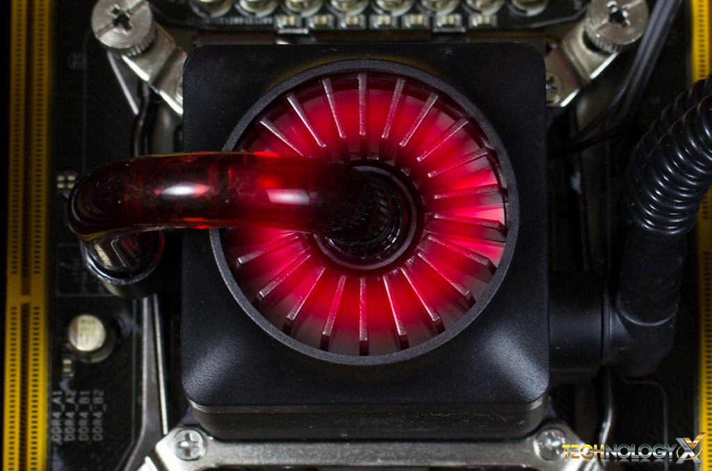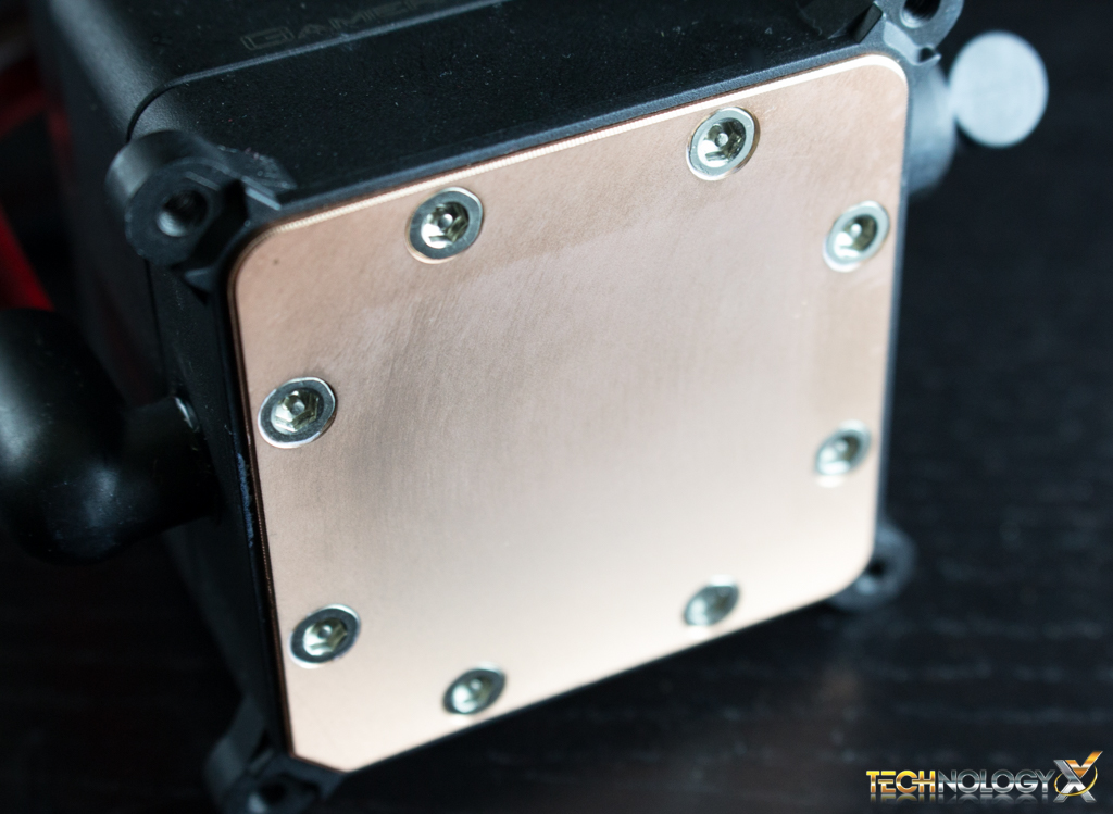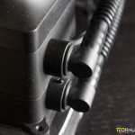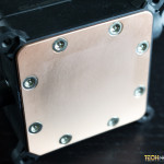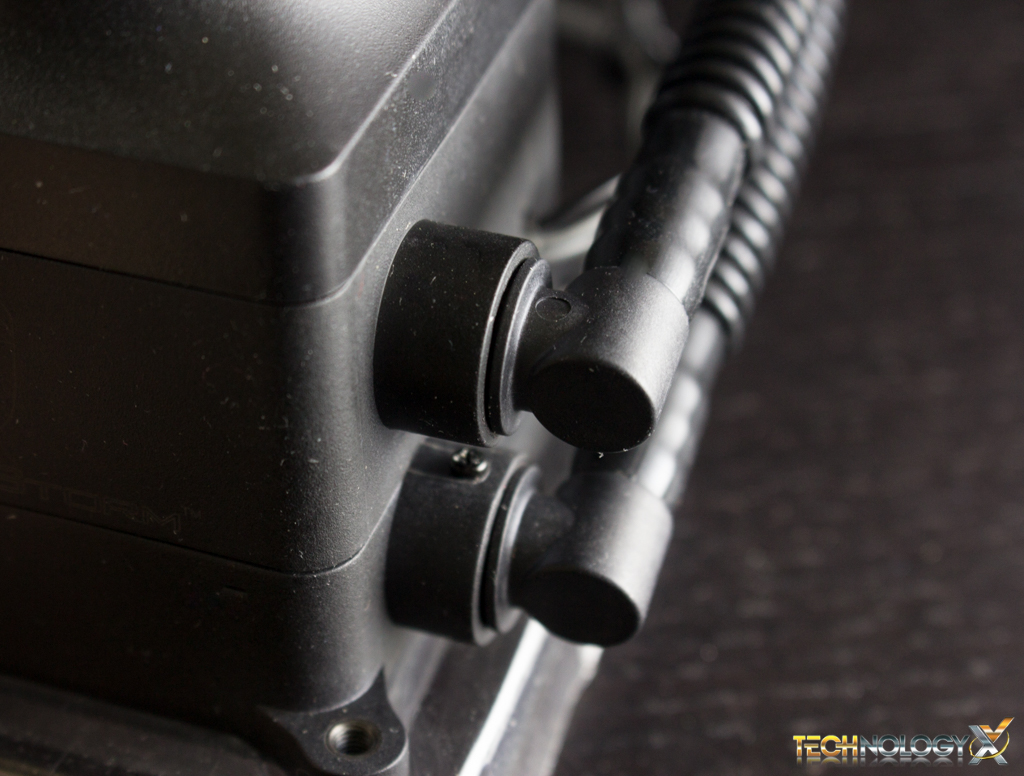Flipping the pump over will reveal the copper-base, which is is completely flat, except circle of screws which hold it in place. Connecting the pump to the radiator is two corrugated plastic tubing, which measures roughly 12″ in length. It isn’t the absolute best tubing we’ve seen, and it can be hard to work with at times, but it is mostly fine. The pump features a life expectancy of 12,000 hours, and a max speed of 3500RPM.