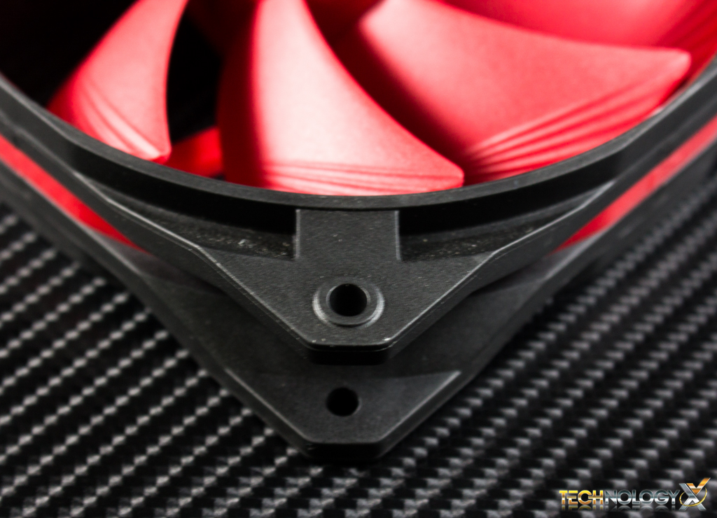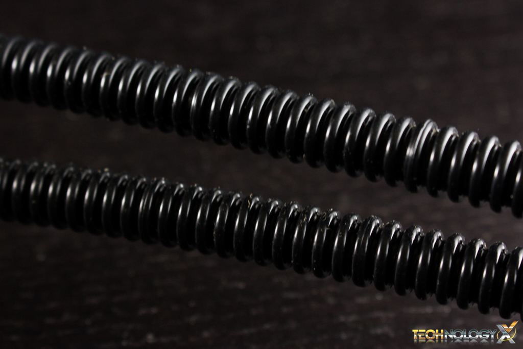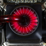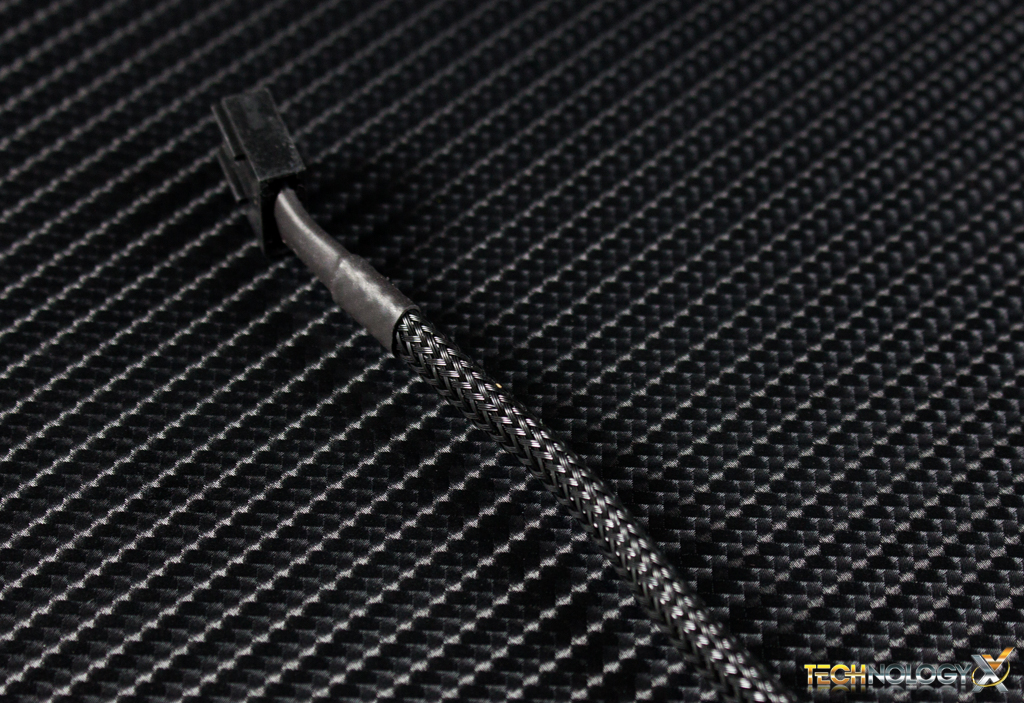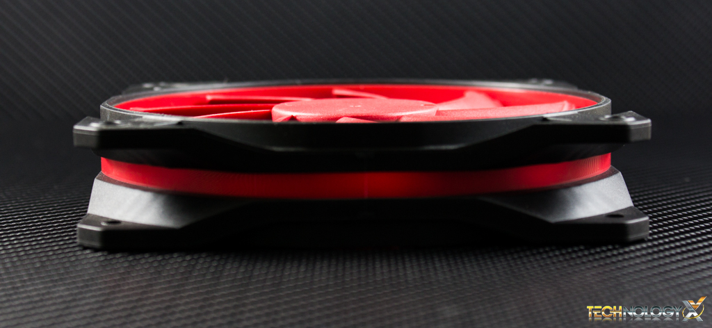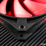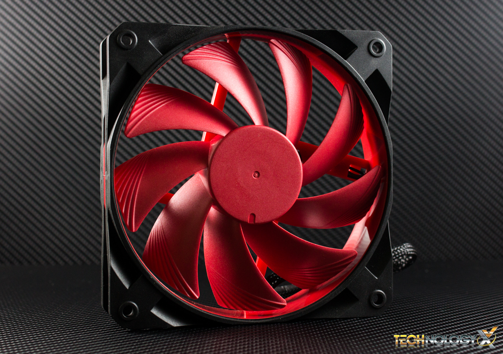 The fan is made up of nine ridged blades, for improved airflow, and feature a wonderful red coloring to match the pump, and the black frame is rubber-coated to limit vibration. The 4-pin power cable is fully braided, and reveals no colored wires at either end, as you’d expect from a premium fan.