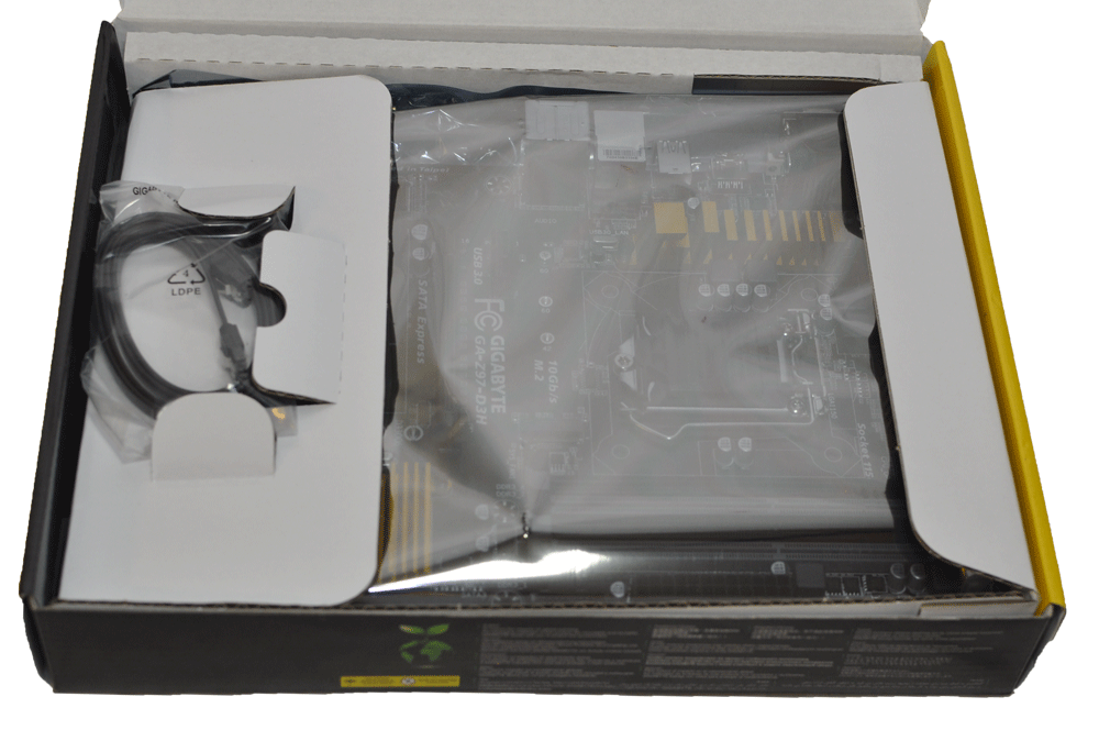 The Z97-D3H certainly doesn’t set any records for bundled accessories, but everything that you need is included out of the box. You get two SATA cables, an I/O shield, as well as some documentation and a driver disc.