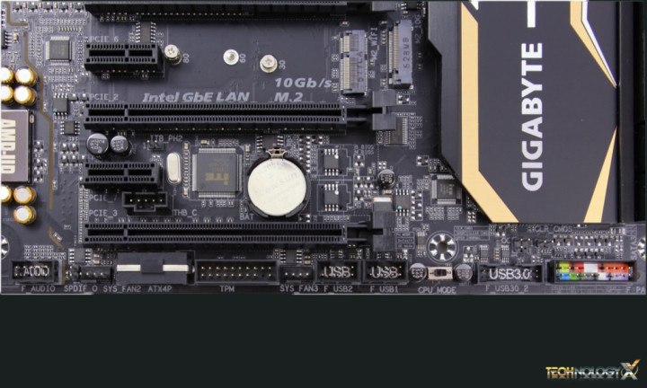 The motherboard comes with 10 x SATA ports and 1 x SATA Express port. There is also a M.2 PCIe slot, although this only supports x2/x1 SSD’s as well as 1 x M.2 Socket 1 connector for the wireless communication module. There are the usual USB internal headers, front panel headers and front panel audio headers. You will also notice the OC mode switch and an extra 4-pin molex ATX connector, which we have not needed this connector. The motherboard also comes equipped with a quality iTE I/O controller chip which takes a way a few I/O hardware parts from the past and bundles them in to one chip.