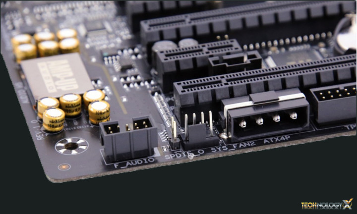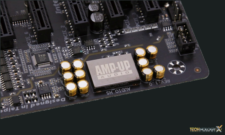 Now, looking at the onboard audio area, you will notice that there is a separate yellow trace, which is in fact illuminated when the system is powered on. There is also software in Gigabyte’s bundle that allows you to adjust settings so it beats to the music. This trace serves a grater purpose than just looking good, it shows a boundary where the audio circuitry is separate from the rest of the motherboards in order to reduce noise. Gigabyte did not just add the normal Realtek audio chip, but rather a nice addition version with a built-in audio amplifier. Each audio channel is on a separate layer of the PCB to eliminate crosstalk and have used premium, solid Japanese audio capacitors made by Nichicon.