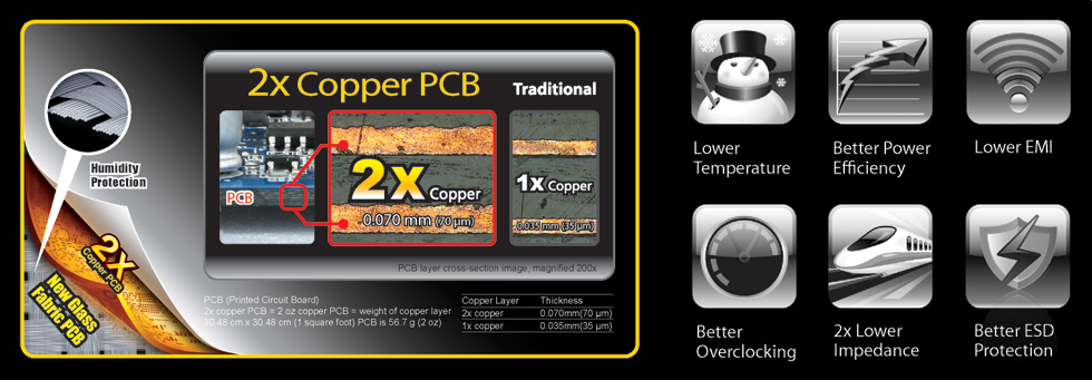With Gigabyte’s exclusive 2X Copper PCBs design, it provides sufficient power trace paths between components to handle greater than normal power loads and to remove heat from the critical CPU power delivery area. This is essential to ensure the motherboard is able to handle the increased power loading that is necessary when overclocking.