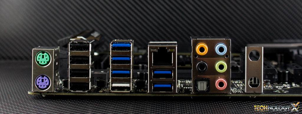 Taking a look at our I/O we have a couple of old-school PS/2 mouse and keyboard ports. It is actually fairly uncommon to have two separate ports on newer boards if they have any at all, so this is interesting to see. We also have 6 USB 3.0 ports (Blue/White), 2 of which are provided by the Intel chipset, the remaining four from the Renesas uPD720210 USB 3.0 controller. The white port doubles as a Q-Flash port for updating the BIOS via USB. We also have 4 additional USB 2.0 ports (Black) which are also provided by the chipset.