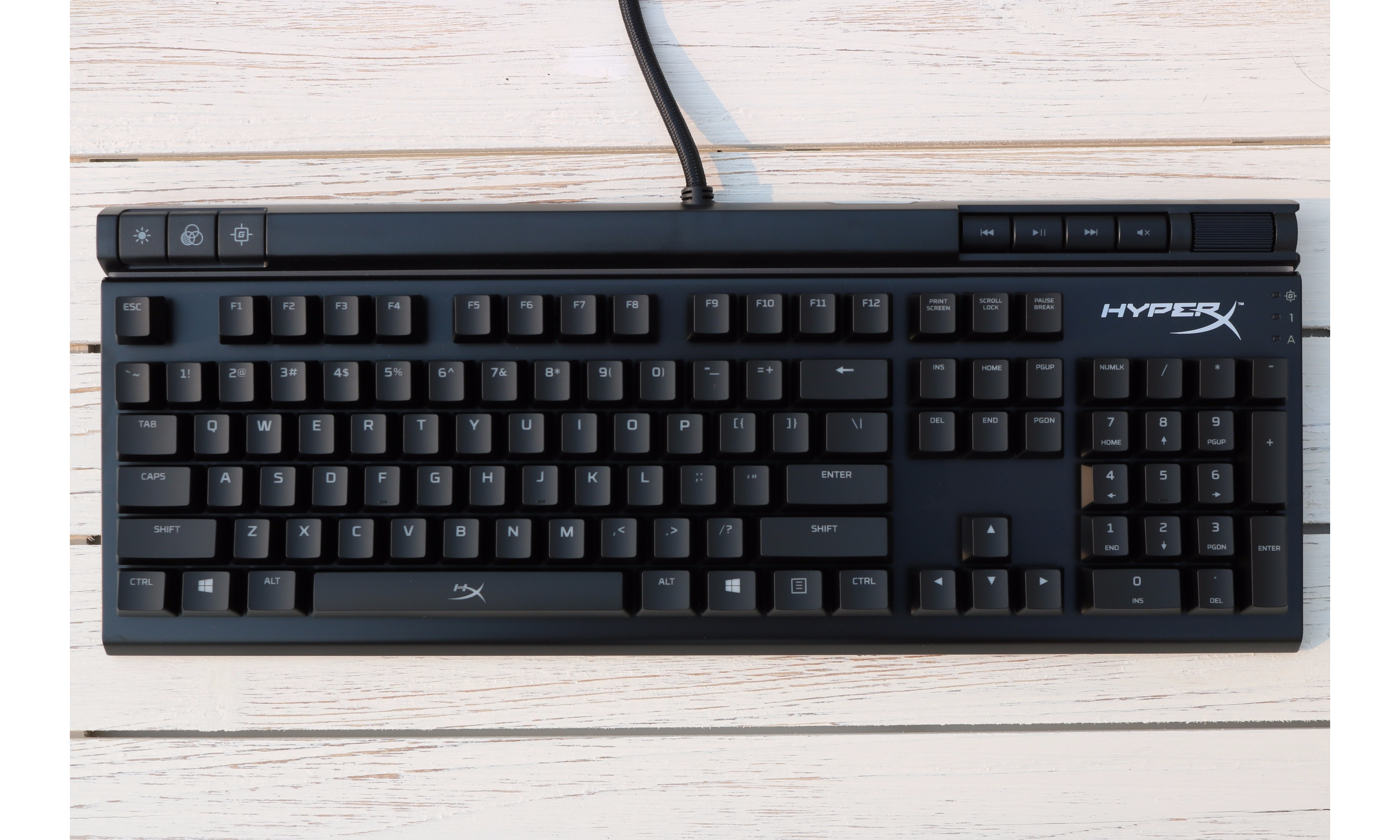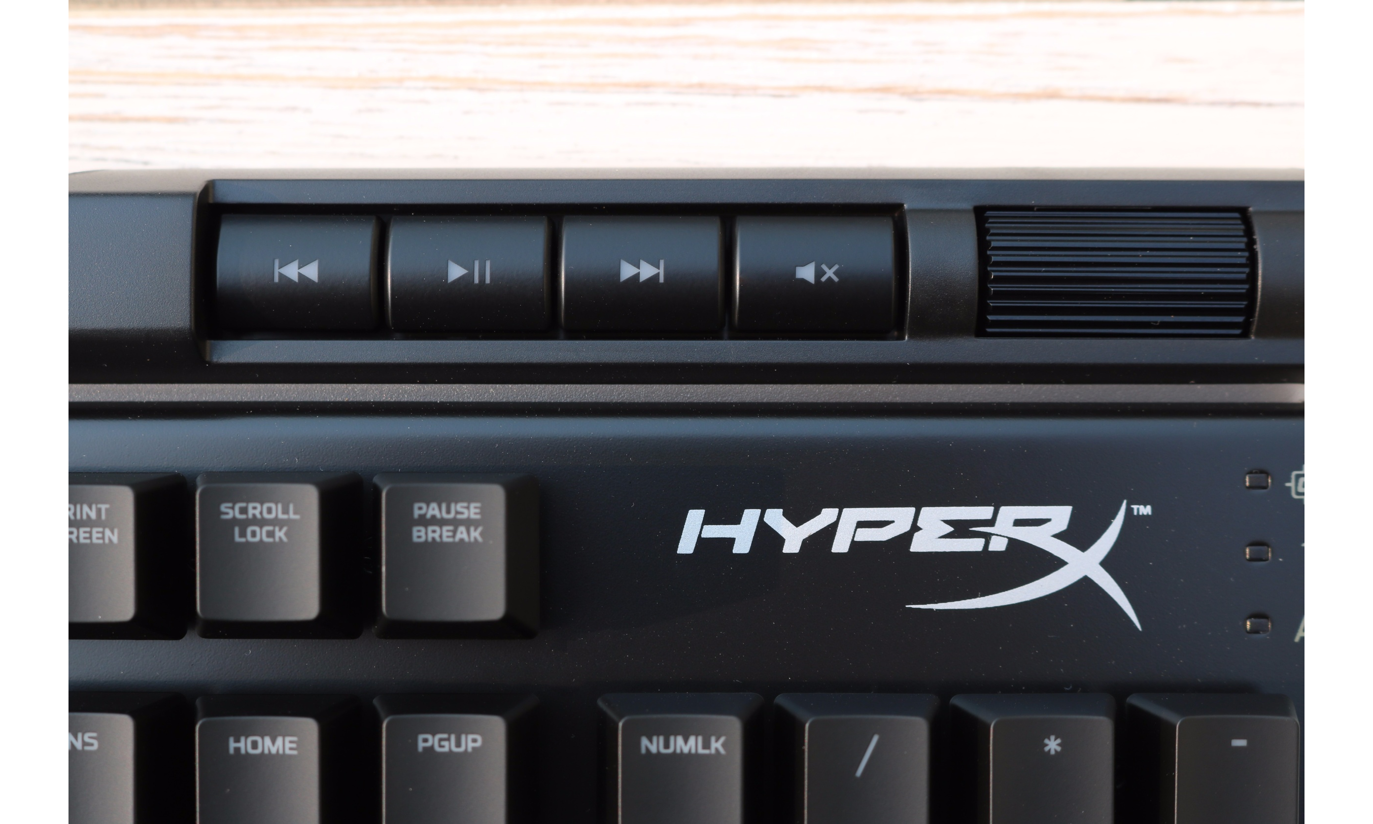 Opposite of these keys is our multimedia zone. A very standard previous, play/pause, next and mute key are located here. Like we said it’s sometimes the small things that matter in products like this. Instead of having two devoted keys for volume, HyperX put a mouse wheel like volume switch in. There is really a lot to like with this board and one thing we would like to see is the left side control switches being illuminated like the rest of the board.