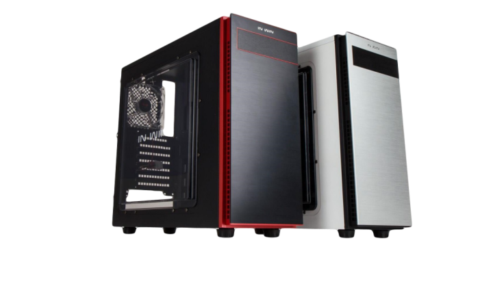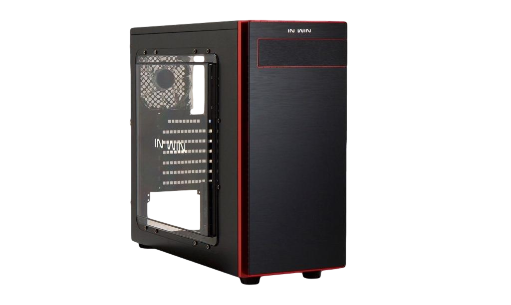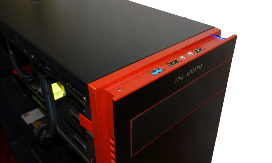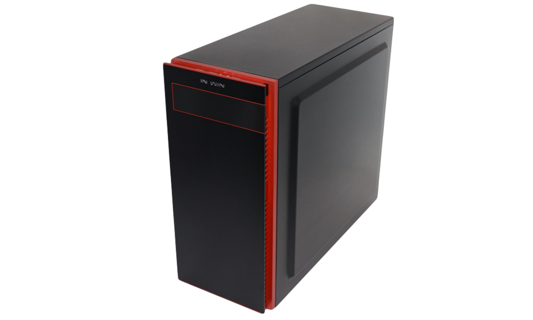 The front panel is an aluminum black hairline textured panel with a removable cover to house a 5.25” drive that is guarded by a thin red border. Directly above that you’ll notice ‘In Win’ tagged in their classic rounded font. In Win has kept the visuals and extras to a minimal when it comes to decorating this chassis, which in our opinion gives it a very professional look.