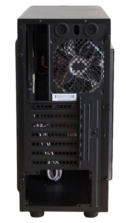 Working our way up, you’ll notice the seven PCI-E slots which is great, except you have to break open the side panel in order to make use of them which makes replacing them later on impossible if you happen to reconfigure or change anything. The only replaceable part in the expansion slot area is the main cover running up and down along the right edge of the slots which is held in place by a single screw and is more or less just to allow ease of installation and reinforce security of your graphics card, wifi card or whatever else you’d choose to install. Above that you’ll notice on the left the Motherboard I/O slot and to the right the fan grill which comes equipped with a 120 mm fan set to push air out the rear. Above that you’ll notice two rubber covered slots for external cooling access.
