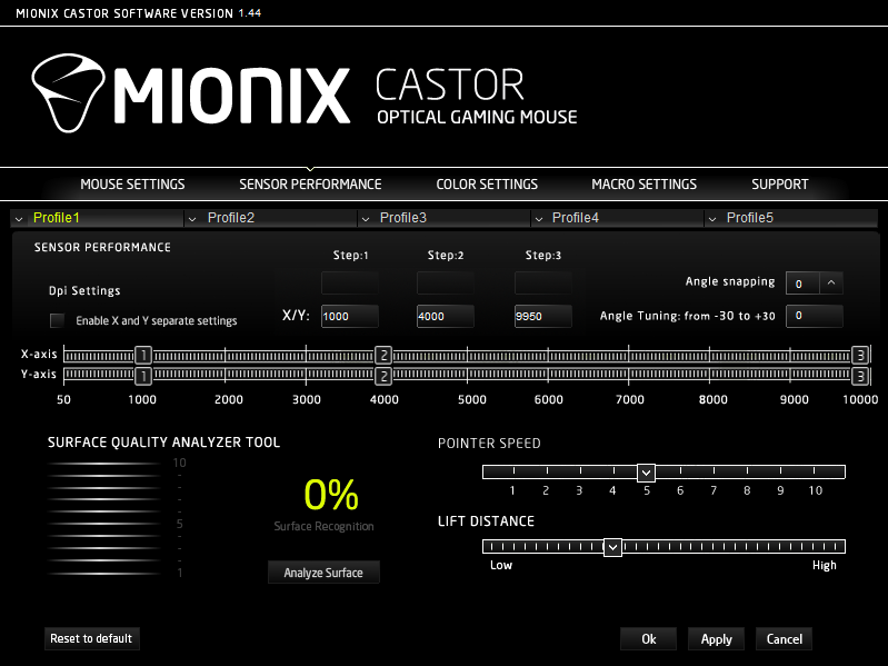 First thing that grabbed our attention on the Sensor Performance page was the big 0%. This is the software’s surface analyzer tool which tells you about the mouse tracking ability on certain surfaces. Aside that you also see the DPI adjustment bar and you can set this with parallel axis’ or you can enable separate X/Y settings depending on your gaming preference. Lift-distance and pointer speed are also adjustable from this page.