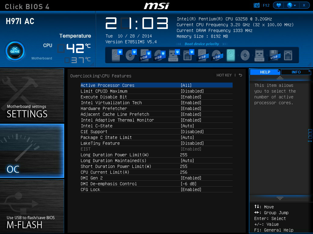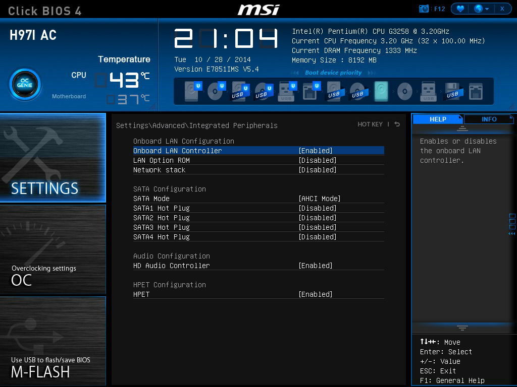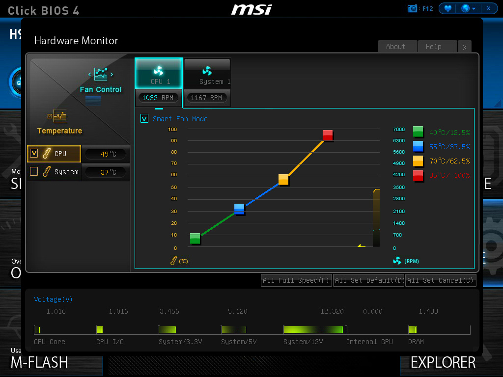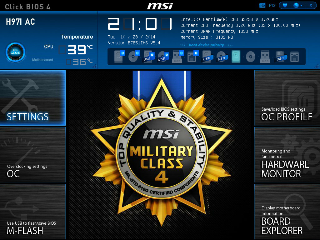 Those of you who are familiar with MSI’s BIOS this is more of the same, this time with the “Military Class” skin showcasing the OC Gene function, displaying temperatures, system information, settings, overclocking functionality, firmware flashing, saved profiles, hardware monitor and the board explorer.