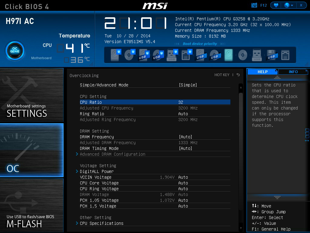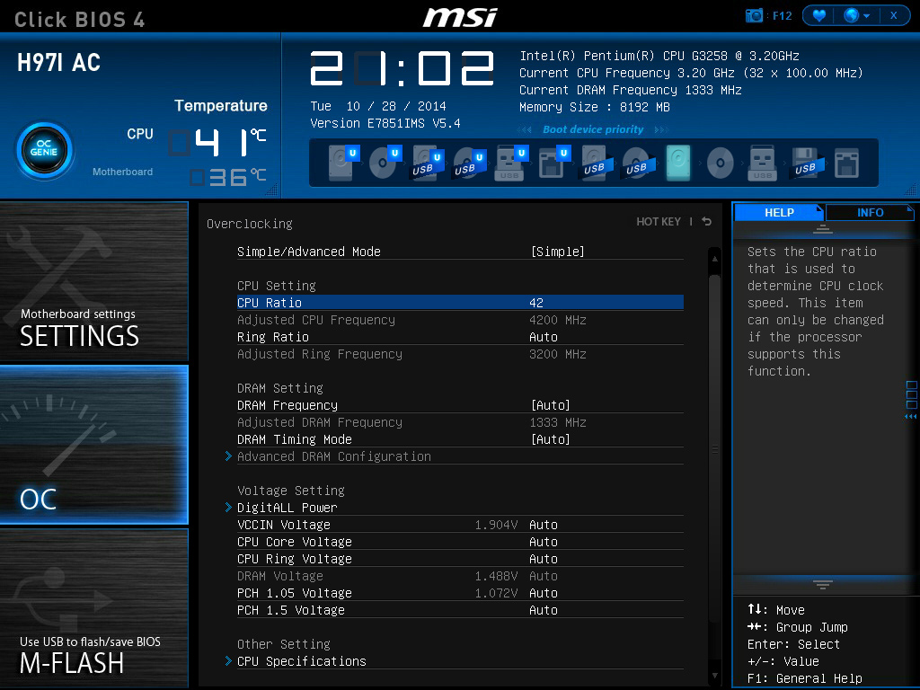 To change the value on the overclocking settings you simply hover the mouse over the CPU ratio number and type in the multiplier, this is a bit different from most motherboards and we noticed the same thing on the MSI G55 SLI Z97 board as well, which is also a Military class board. The voltage is left to auto in this case but the goal we went for was 4.4 GHz below 1.22V.